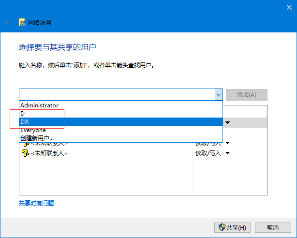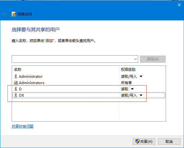 把用户D设置为“读取”,用户DX设置为“读取/写入”。