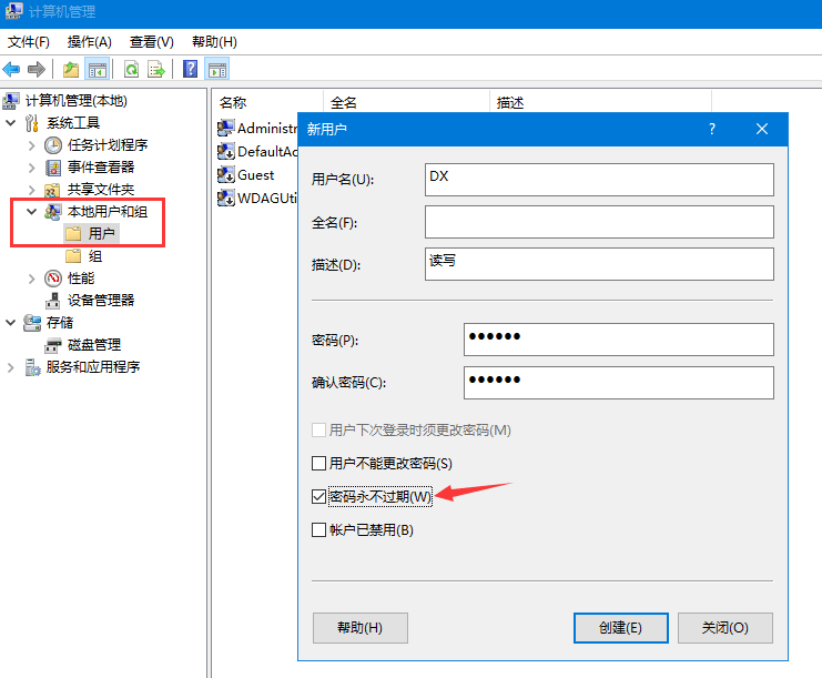 用户名可设为自己觉得好记的,设置好密码,“密码永不过期”勾上。