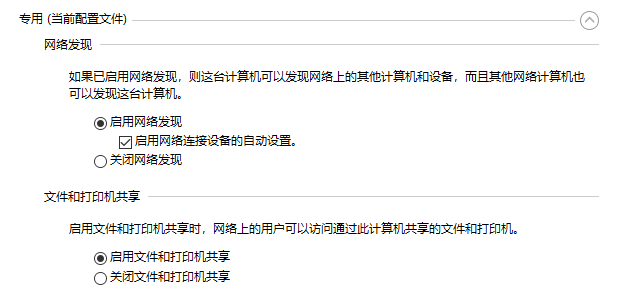 在当前配置文件里启用“网络发现”和“文件和打印机共享”,在所有网络里“启用密码保护共享”。
