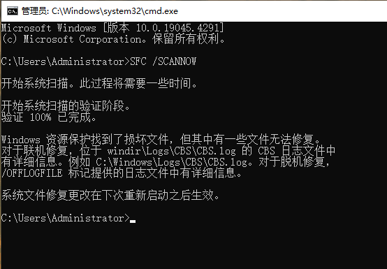 在命令提示符输入“SFC /SCANNOW”,按回车等待修复完成,完成后重启。