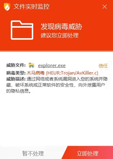 前段时间火绒也出现过这种情况,微软补丁更新后触发查杀特征导致,导致explorer.exe被当成病毒查杀掉。