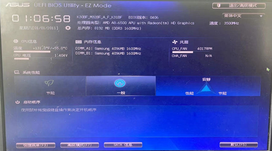 还有在下方“启动顺序”中没有发现有启动设备,正常情况下会有硬盘、光驱等设备,没有检测到,大概率硬盘问题,导致未检测到。