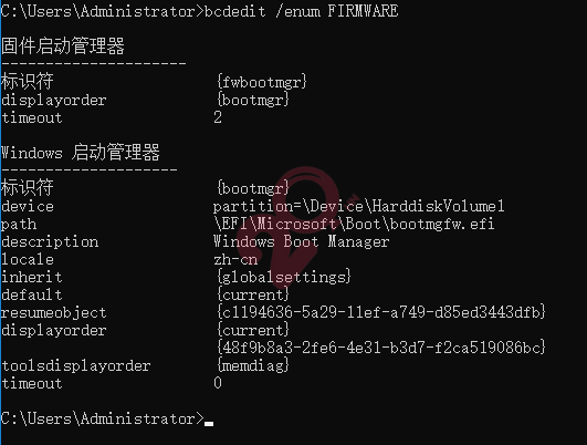 命令提示符中输入“bcdedit /enum FIRMWARE”可查看NVRAM内的启动项,如上图高亮,有五条,前三条是自带的光驱启动、移动存储启动、网络启动,后二条是闪迪的U盘启动信息。这两条U盘启动信息是U盘启动留下的。
