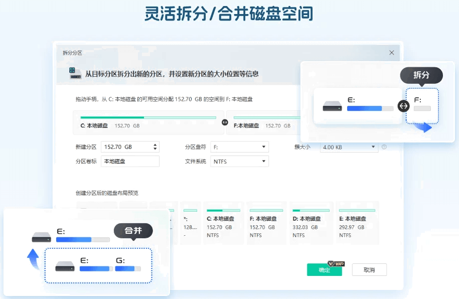 软件还允许用户将相邻分区合并为一个,或将单一大分区拆分为多个小分区。这一功能使得用户可以更加灵活地应对不同的存储需求。