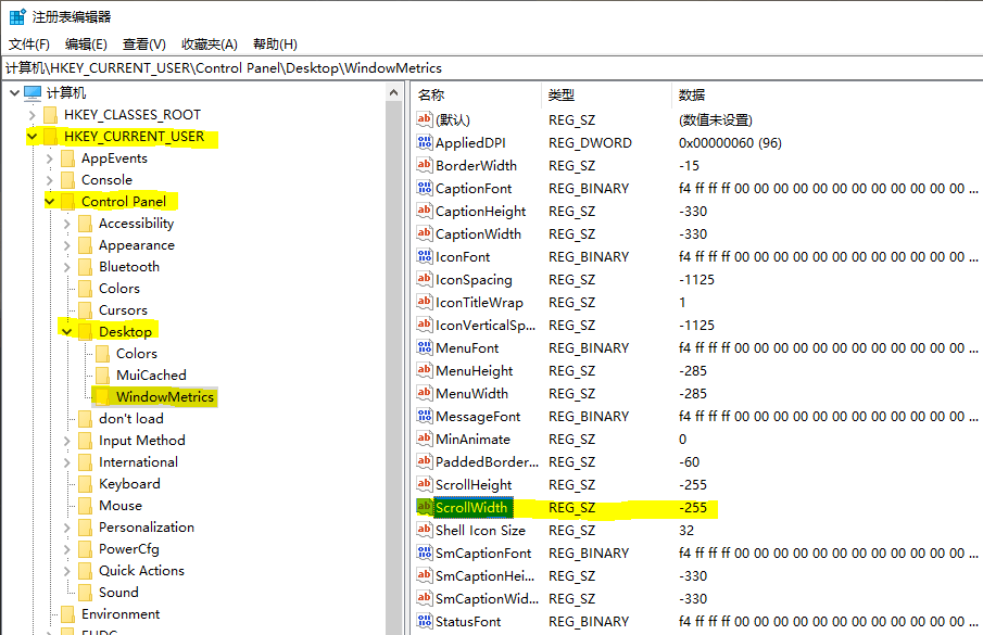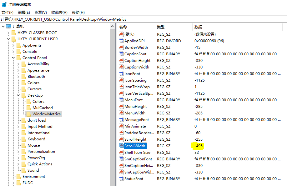 在右边窗口找到“ScrollWidth”,默认是“-255”,数值越小滚动条就越大(值是以-15为一单位进行计算的),下面演示改为“-495”。
