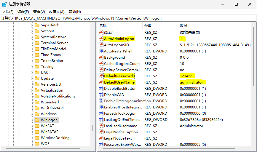 AutoAdminLogon,值设置为1(0禁用,1启用)