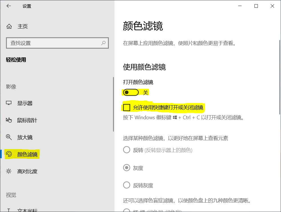 手动关闭: “开始”,“设置”,“轻松使用”,在左侧点击 “颜色滤镜”,关闭右侧的 “打开颜色滤镜”开关,取消勾选“允许使用快捷键打开和关闭滤镜” 。