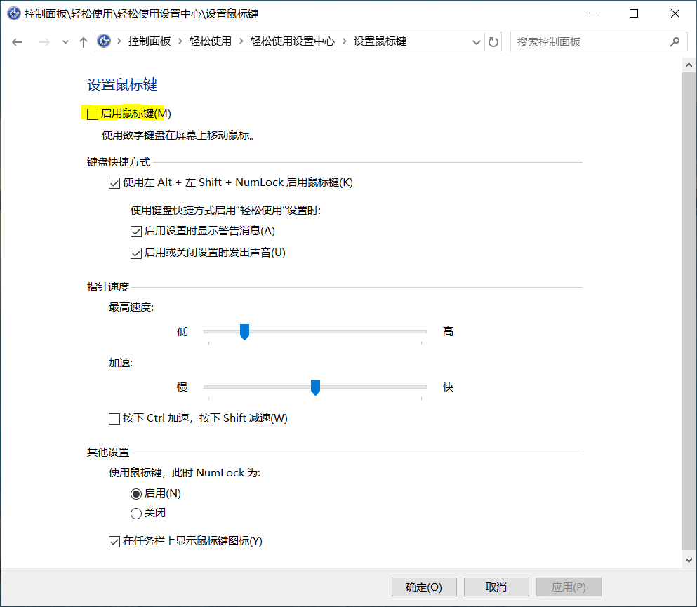 Win10,控制面板-轻松使用-更改键盘的工作方式-启用鼠标键(把勾去掉)。