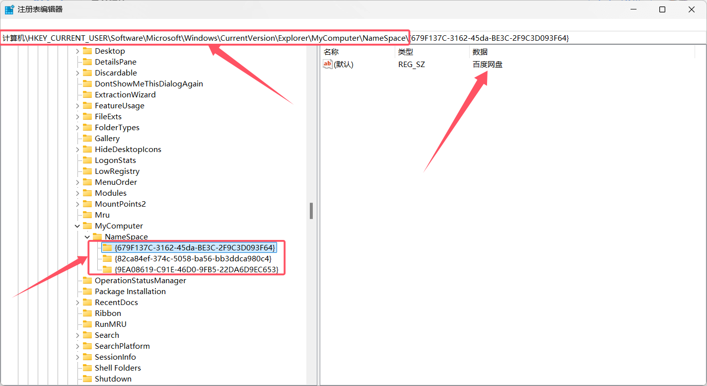 避免出现误操作,在删除前,先备份好注册表(右键NameSpace,导出到桌面,双击导入该reg即可恢复)。