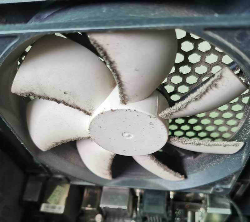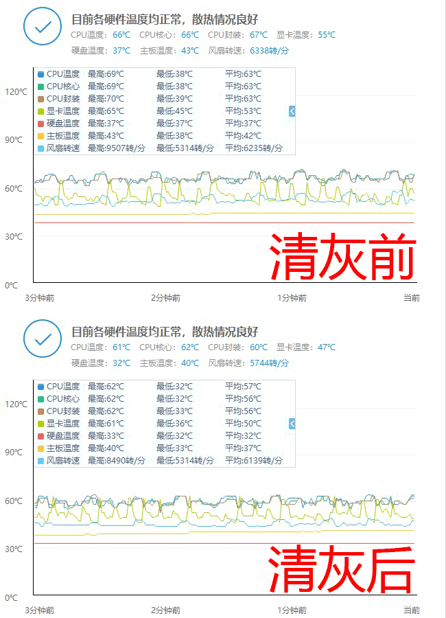 使用吹风机把能吹掉的灰尽量清理掉,吹不掉的使用软毛刷刷一刷即可,CPU散热器可拆下金属散热体在水龙头下冲干净,等晾干再进行安装,重新涂抹散热硅脂。