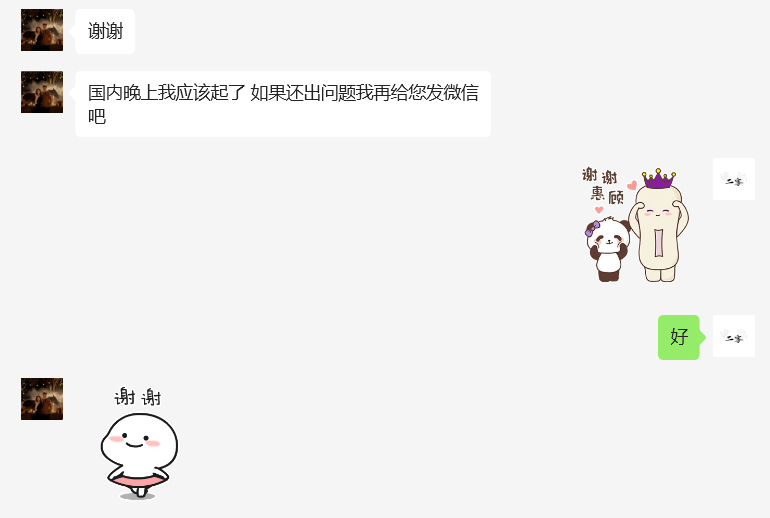 电脑铺工程师通过微信视频指导用户进行检查,确定原因给出解决方案,最后用户致谢,称国内晚上自己应该已起床,若再出问题会微信联系,用户再次感谢,双方沟通暂告一段落。整个交流过程中,用户清晰阐述问题与自身困境,电脑铺工程题也给出相应建议,最终达成后续有问题再联系的约定。