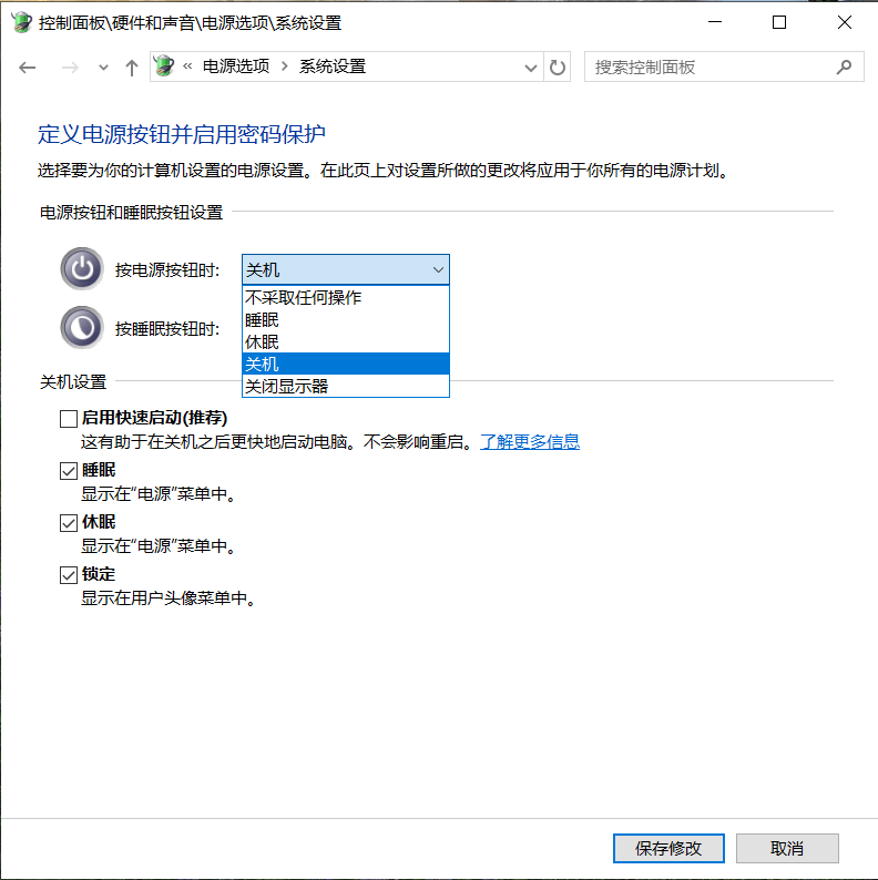 控制面板——系统和安全——电源选项——选择电源按钮的功能