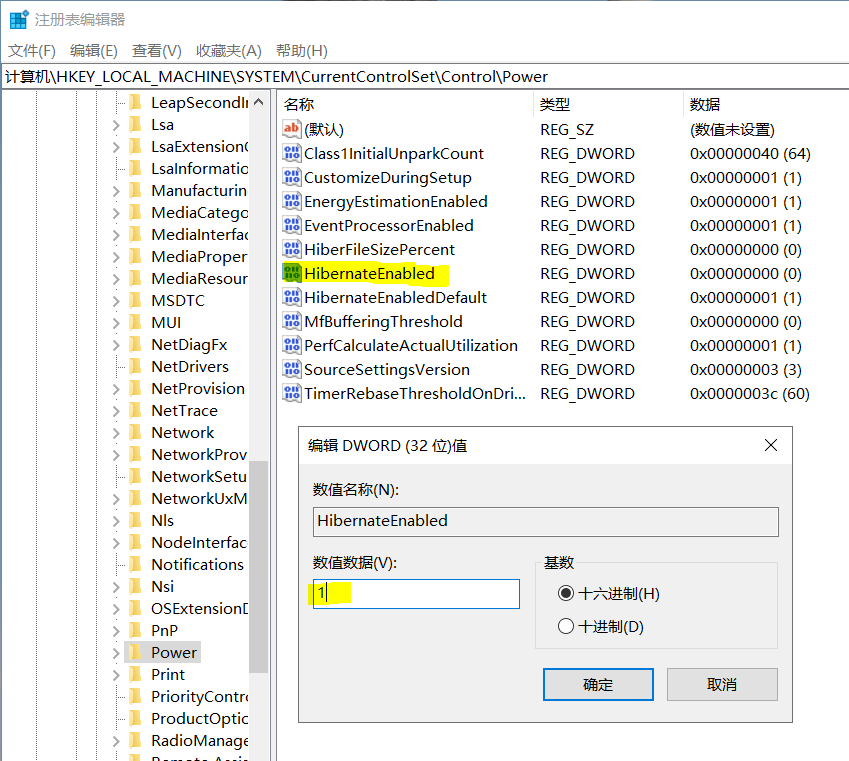 亦可在注册表中导航到路径“计算机\HKEY_LOCAL_MACHINE\SYSTEM\CurrentControlSet\Control\Power”,双击“HibernateEnabled”键,将其值改为 “1”。