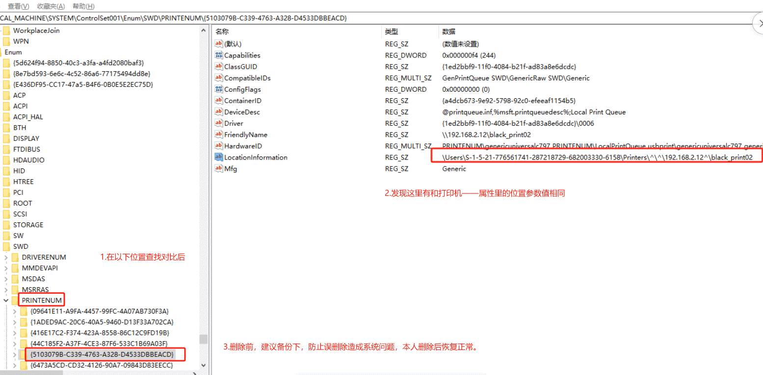 “计算机\HKEY_LOCAL_MACHINE\SYSTEM\ControlSet001\Enum\SWD\PRINTENUM”