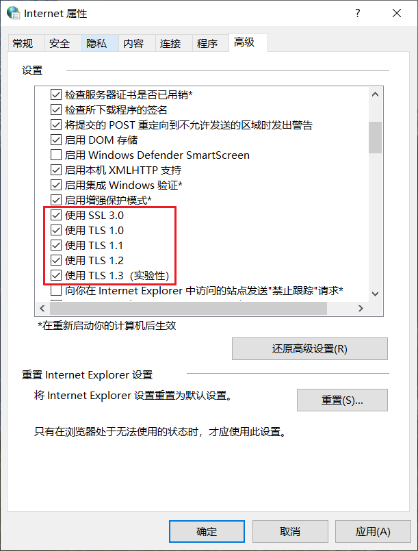 在控制面板里打开“Internet属性”,转到“高级”,勾远所有的TLS即可解决“向服务器发送登录请求失败,无法登录服务器”的问题。