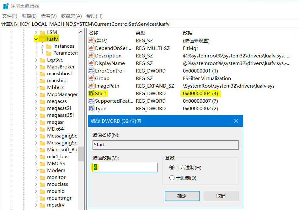 计算机\HKEY_LOCAL_MACHINE\SYSTEM\CurrentControlSet\Services\luafv