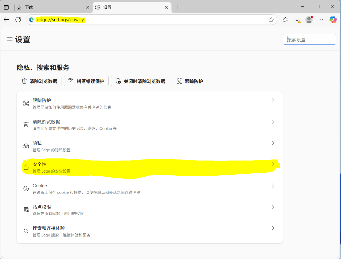 对于禁用或精简安全中心的用户,打开Edge浏览器,在地址栏输入“edge://settings/privacy”;