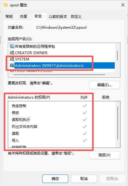 3、确保 SYSTEM 和 Administrators 组均拥有完全控制权限