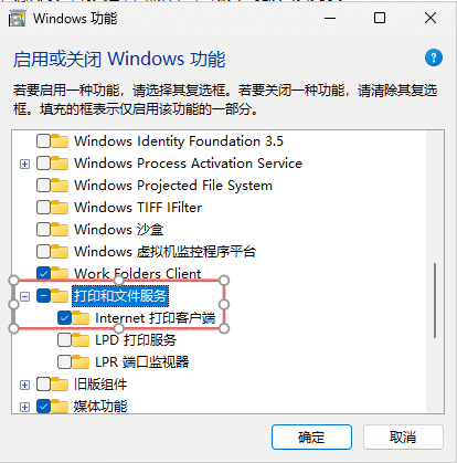 3、重启后重复上述步骤,勾选”打印和文件服务“,再次点击确定并重启