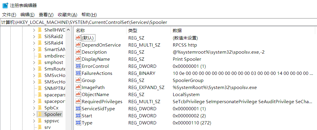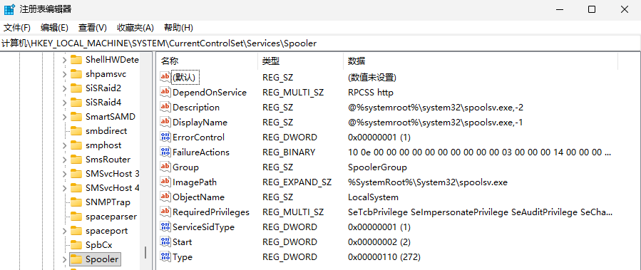 定位注册表路径:HKEY_LOCAL_MACHINE\SYSTEM\CurrentControlSet\Services\Spooler