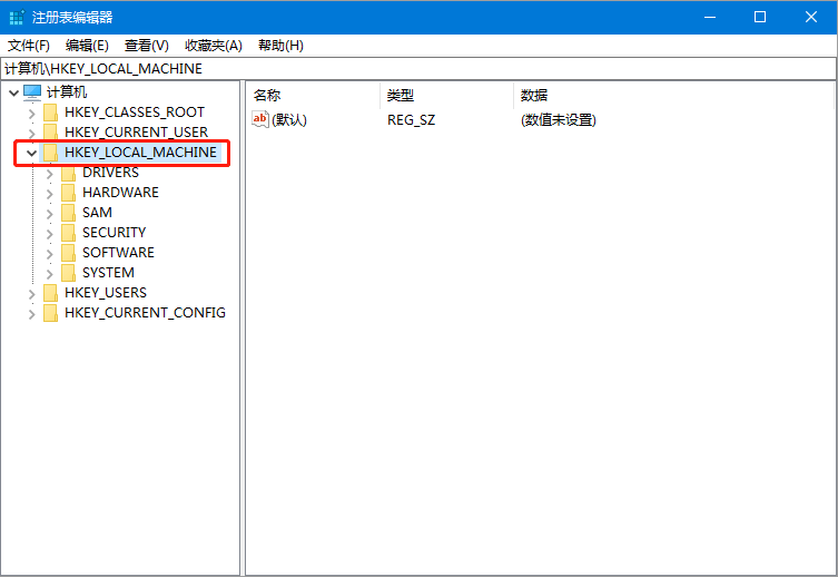 2、选中“HKEY_LOCAL_MACHINE”(此处以“HKEY_LOCAL_MACHINE”下的“SYSTEM”项为例);
