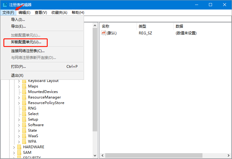7、修改完之后,选择“文件”>>“卸载配置单元”;
