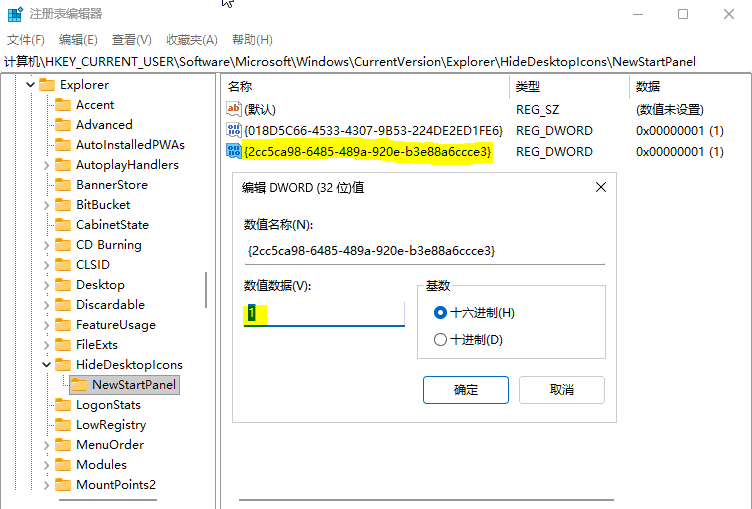 HKEY_CURRENT_USER\Software\Microsoft\Windows\CurrentVersion\Explorer\HideDesktopIcons\NewStartPanel
