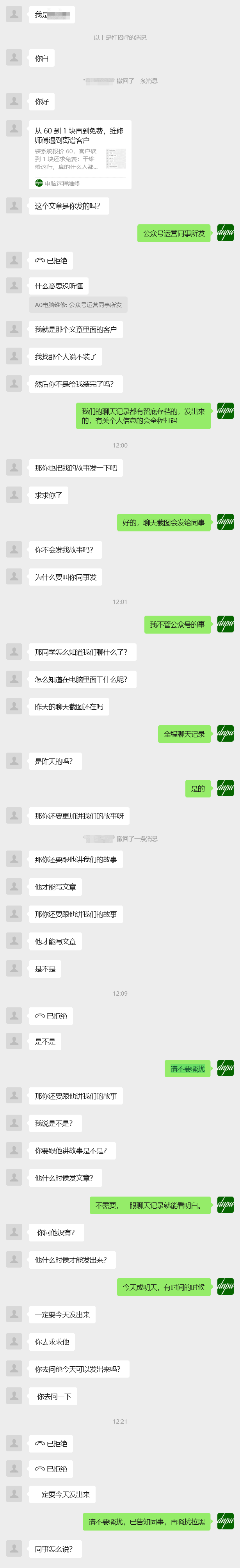 坚决地回绝其要求后,表示再一次重装需要收费 60,不愿意花钱还要退款的情况,可想而知是不会同意的,又提出让同事教他重装系统,远程操作都花了 3 个小时,教他重装可能要用去 6 个小时,教学费用更不可能有的,只好干脆的回绝。