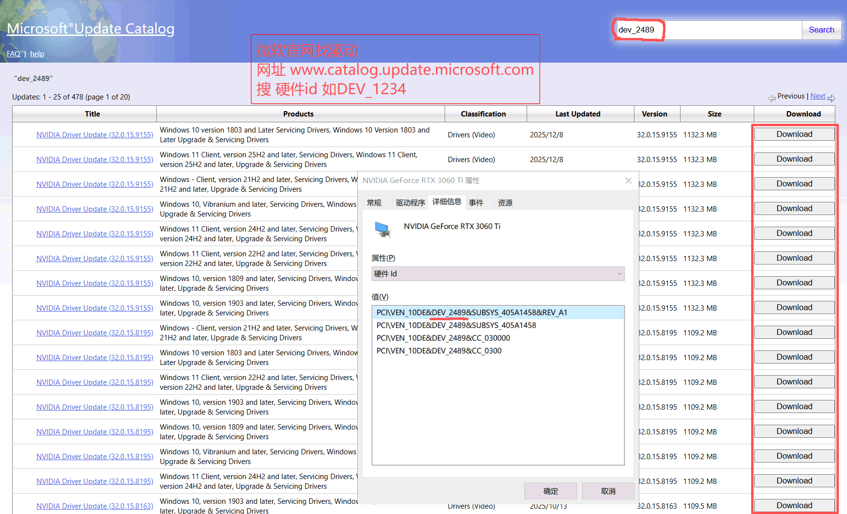 搜索:把复制的完整硬件 ID 粘贴到网站搜索框,点击搜索;搜不到可精简为“VEN_xxxx&DEV_xxxx”或“DEV_xxxx”扩大搜索范围;